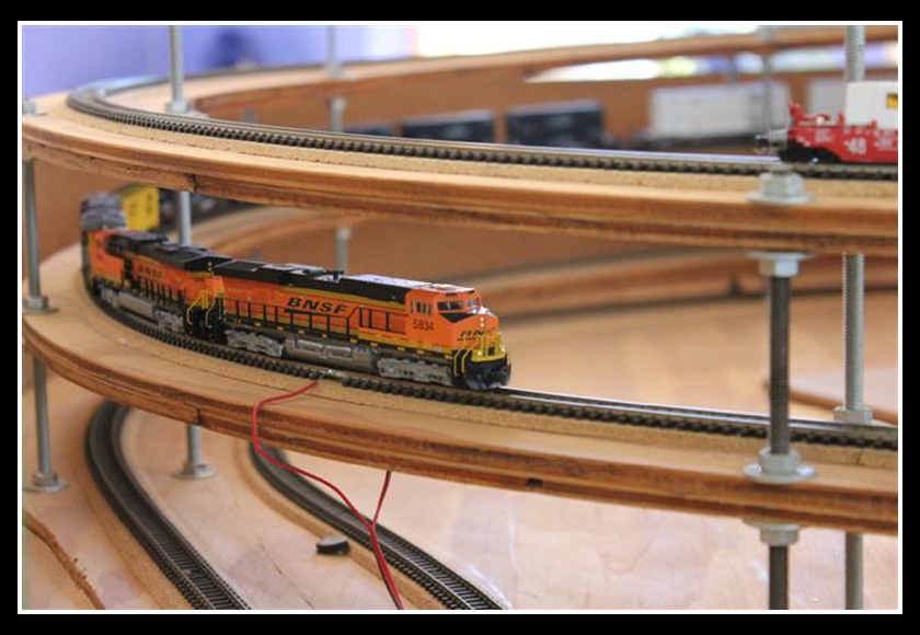 twelve meters by five meters although the layout area is only 8m X 5m and is in the shape of a large E. The layout consists of two levels that are connected at each end by a helix. The operations revolve around an eight track visible staging yard that represents destinations beyond the modelled area, and a large classification yard (Whitefish) where trains are broken apart and made up according to the need of the individual businesses and industries located in the towns along the route.