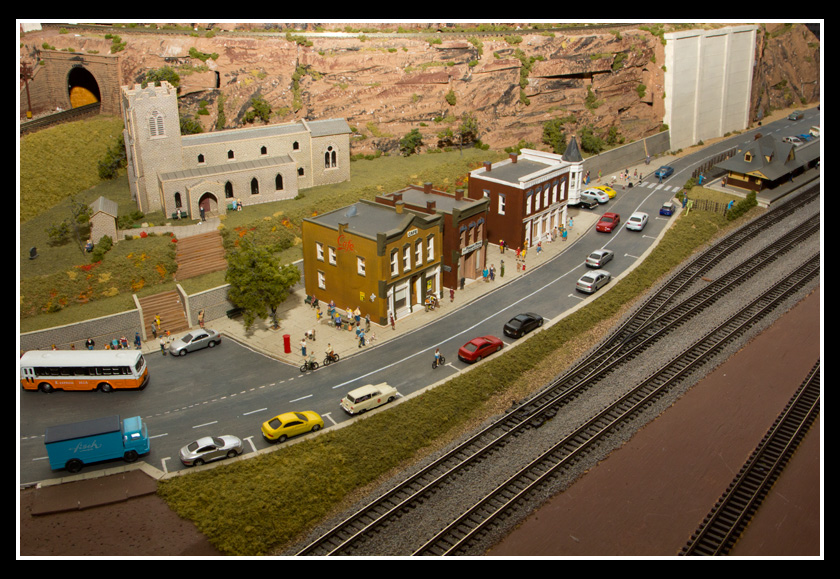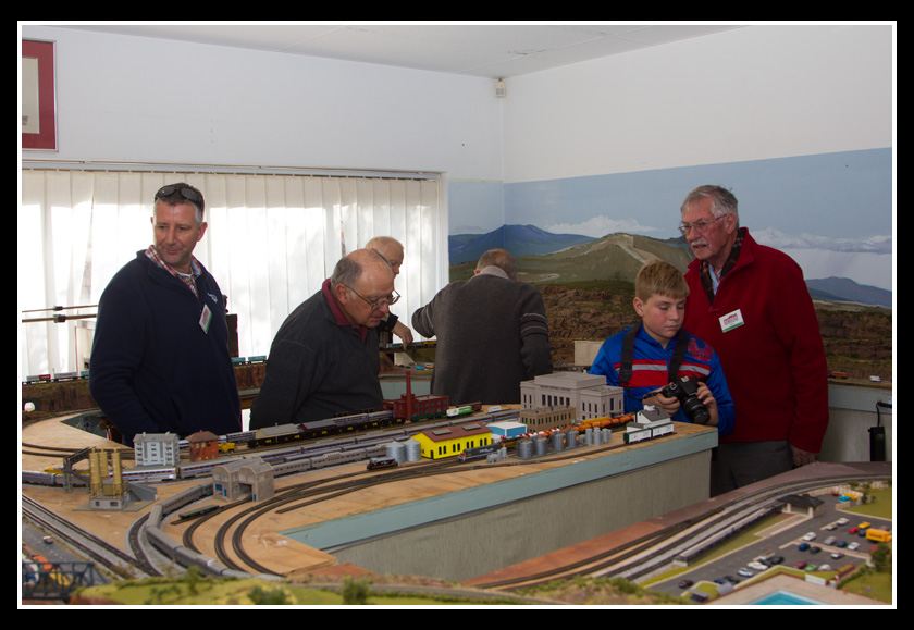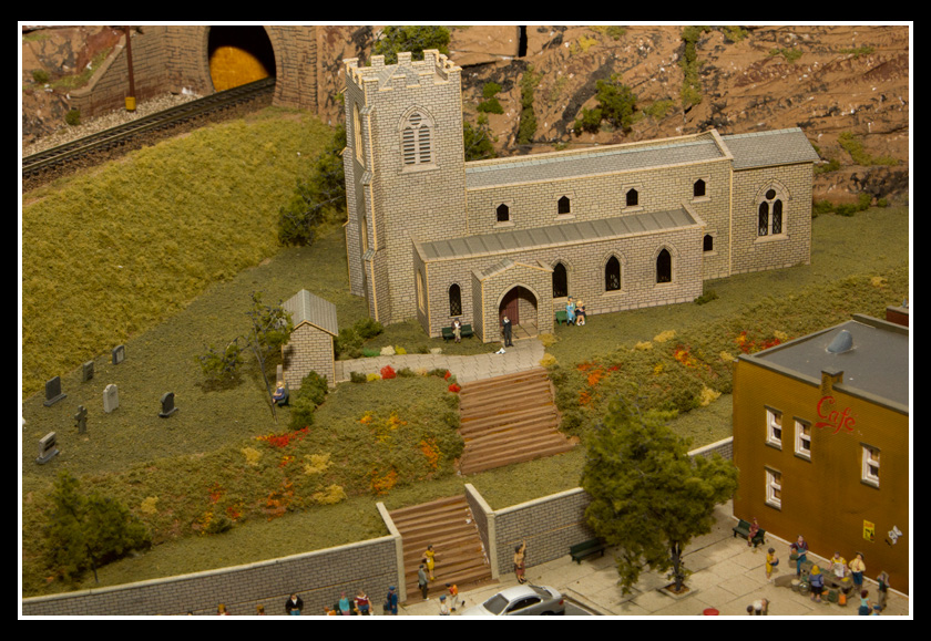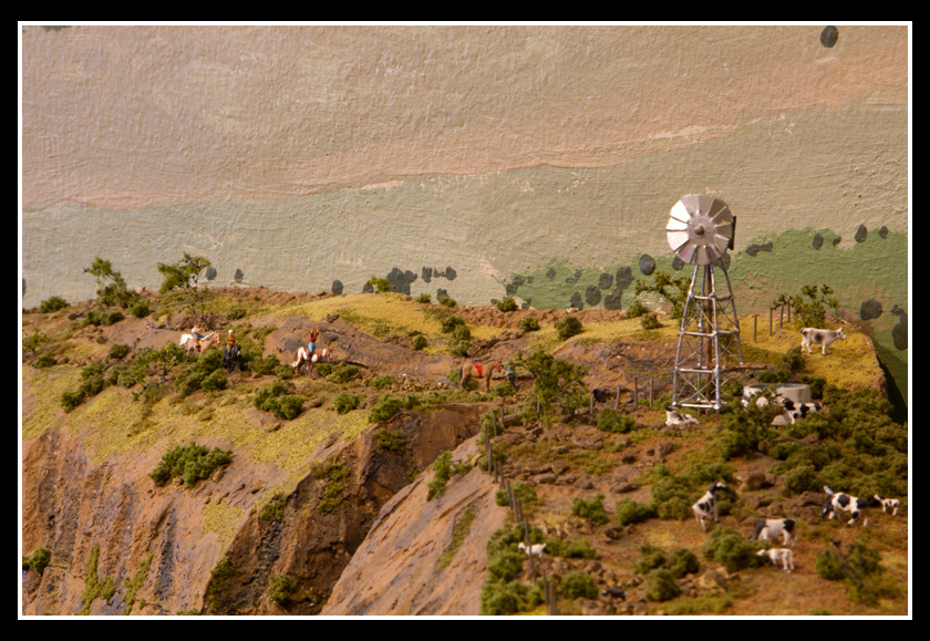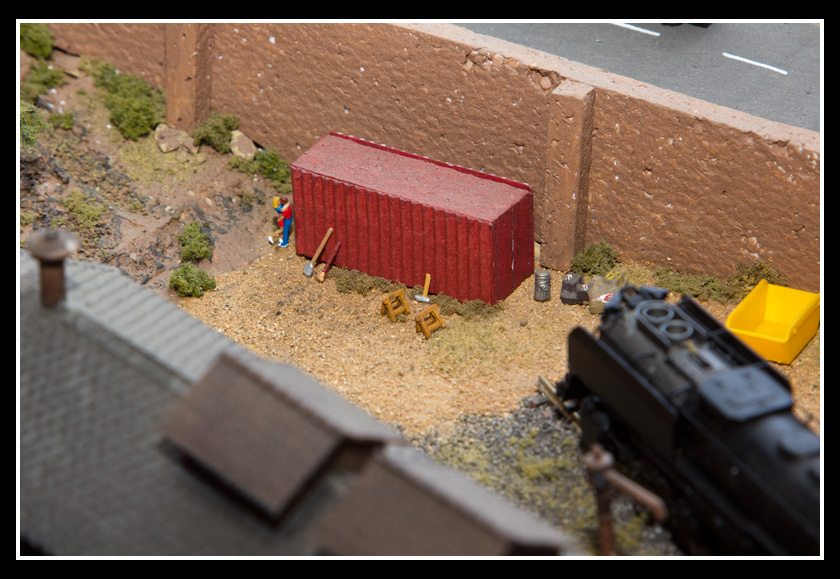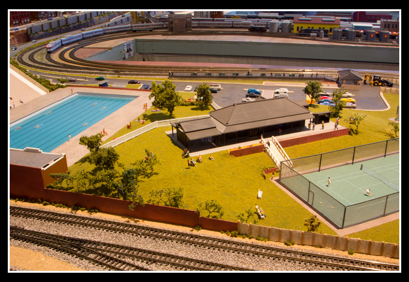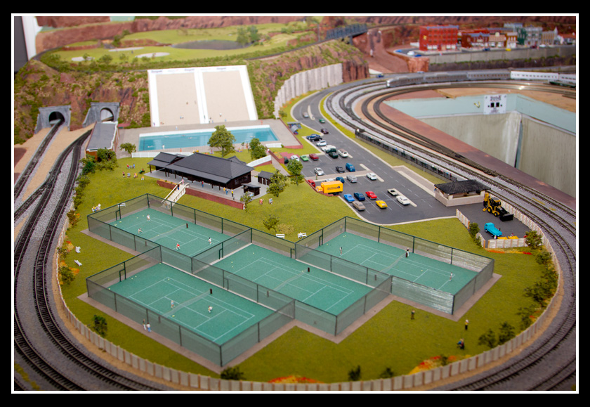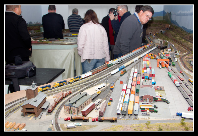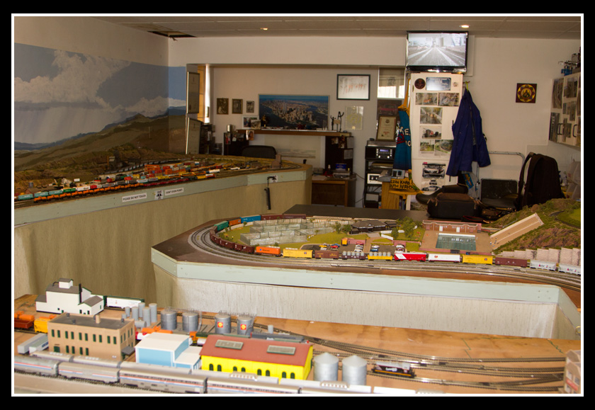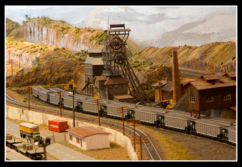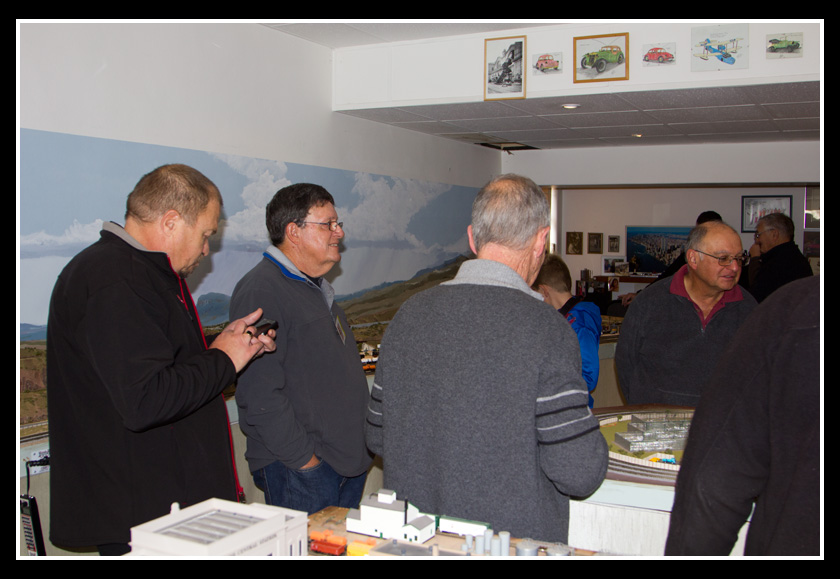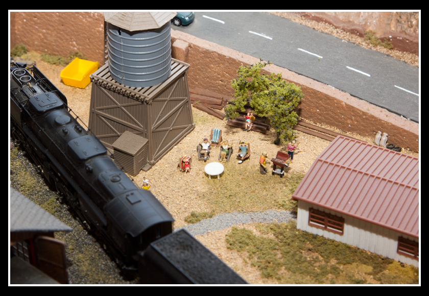 There are 2 towns and at the one return loop, a very large container facility, coal mine, locomotive work shop and more. Everywhere one looks, there are people. There are multitudes of little scenes everywhere. Folk sitting around a table near a steam train, hikers on a mountain ledge, horse rides herding cattle, people around town and a church. The list just goes on and on. Ron challenged everyone to find the person with the “plumbers crack”, the “naked sunbathers” and the “kissing couple”. Did the EMRIG members have fun looking for them. I myself only found the kissing couple when reviewing the photos. So check the photos out for that and much much more.