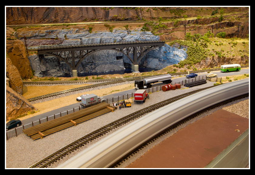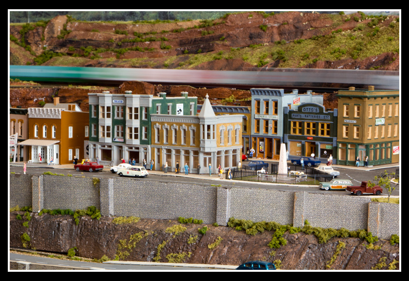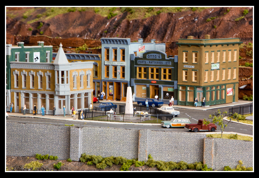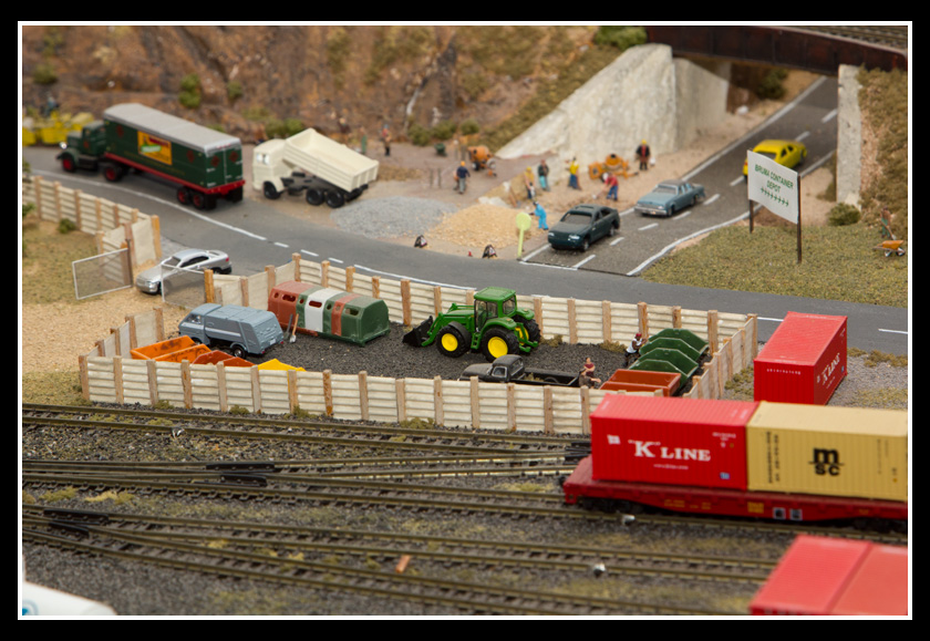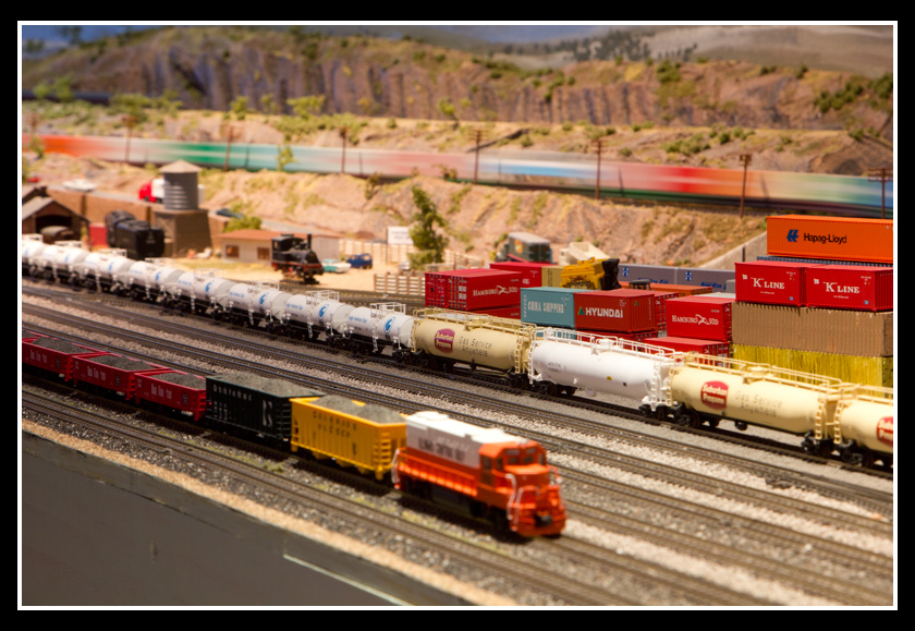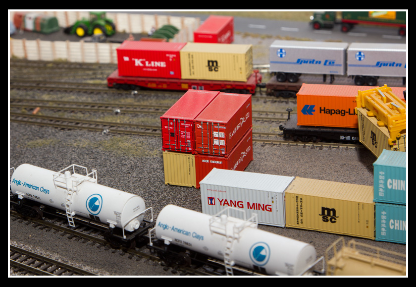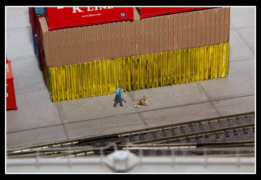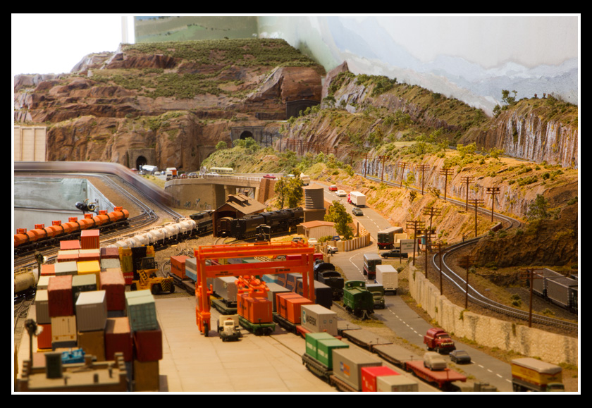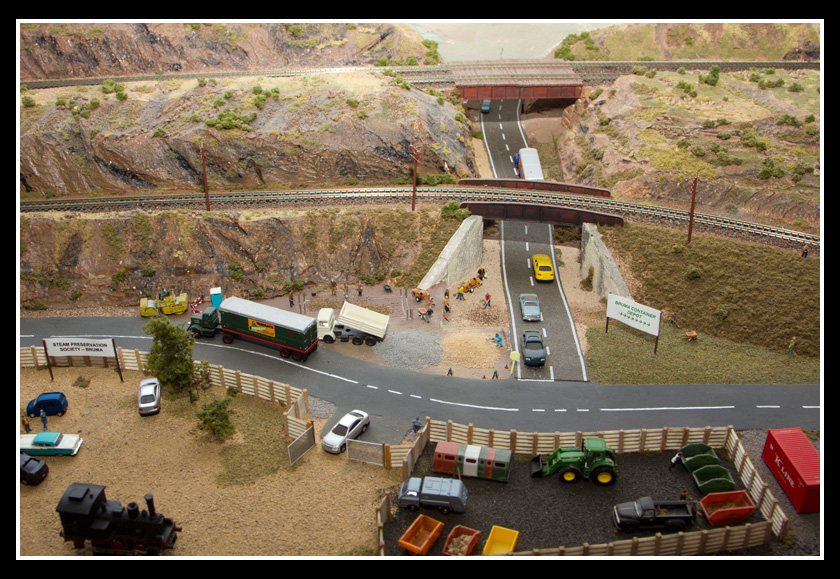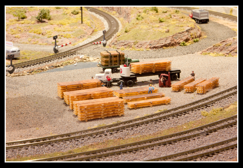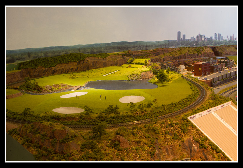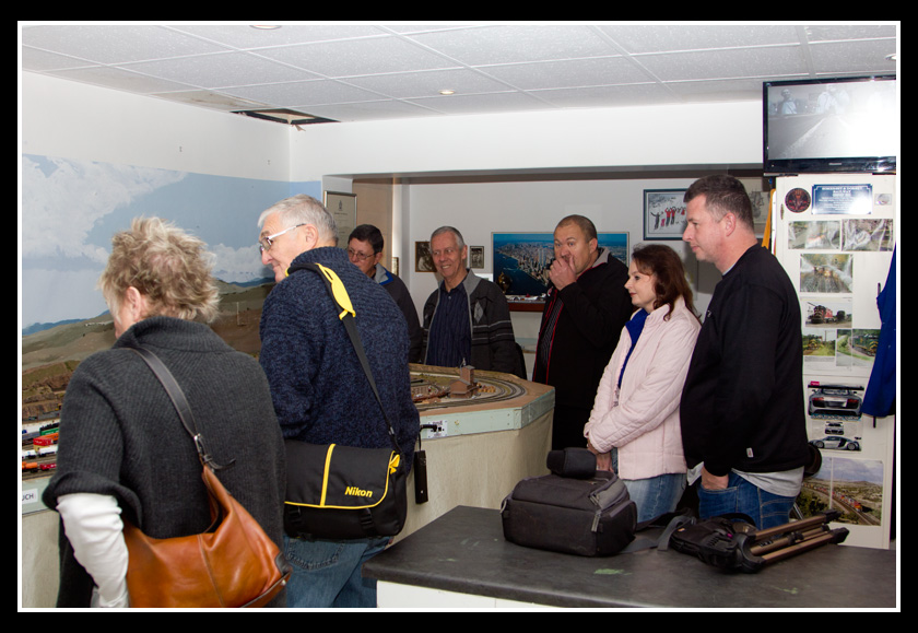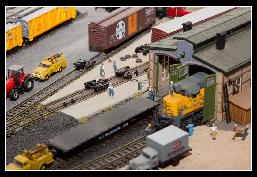 There are 2 towns and at the one return loop, a very large container facility, coal mine, locomotive work shop and more. Everywhere one looks, there are people. There are multitudes of little scenes everywhere. Folk sitting around a table near a steam train, hikers on a mountain ledge, horse rides herding cattle, people around town and a church. The list just goes on and on. Ron challenged everyone to find the person with the “plumbers crack”, the “naked sunbathers” and the “kissing couple”. Did the EMRIG members have fun looking for them. I myself only found the kissing couple when reviewing the photos. So check the photos out for that and much much more.