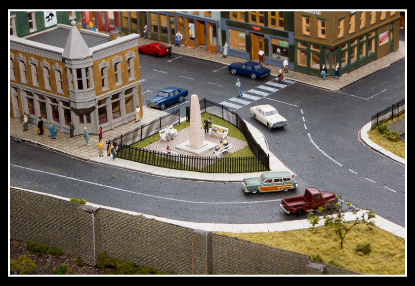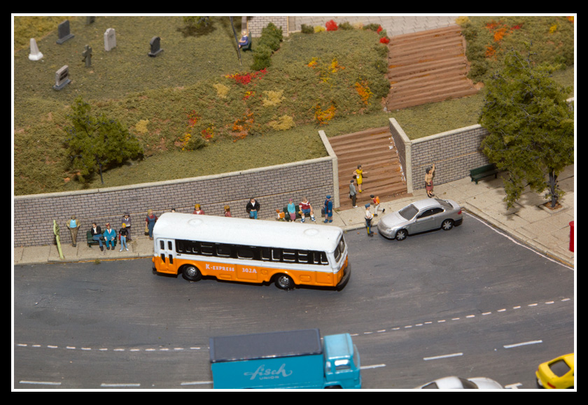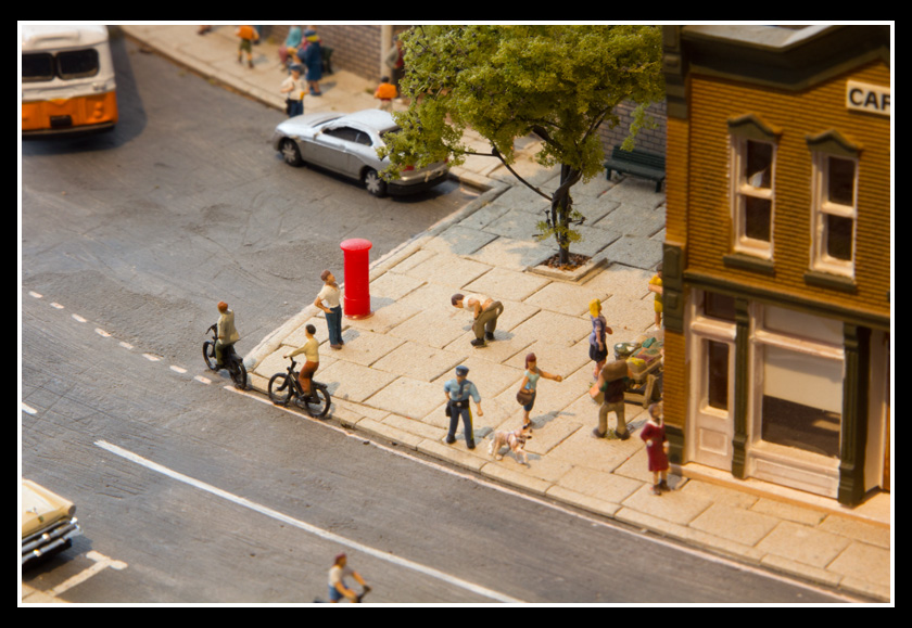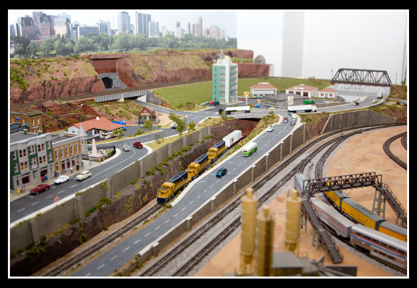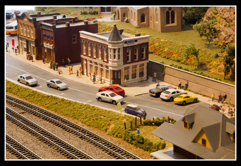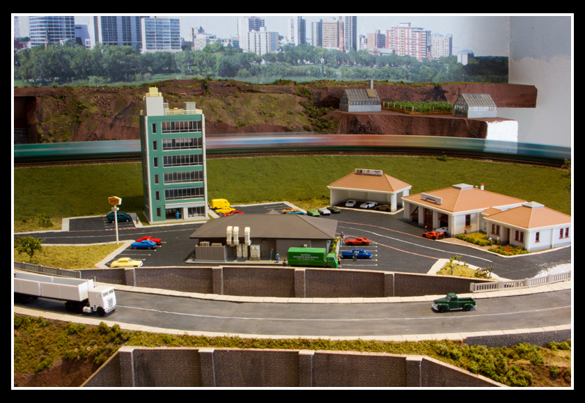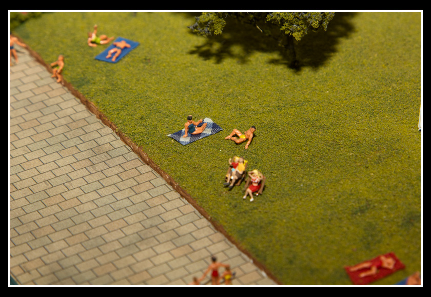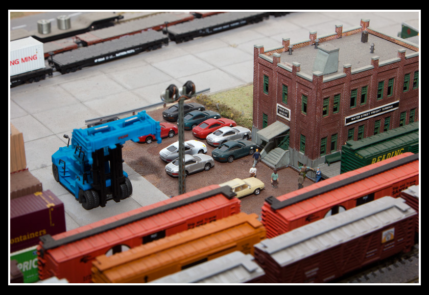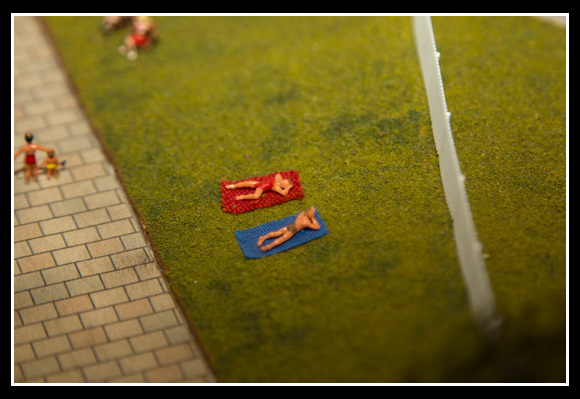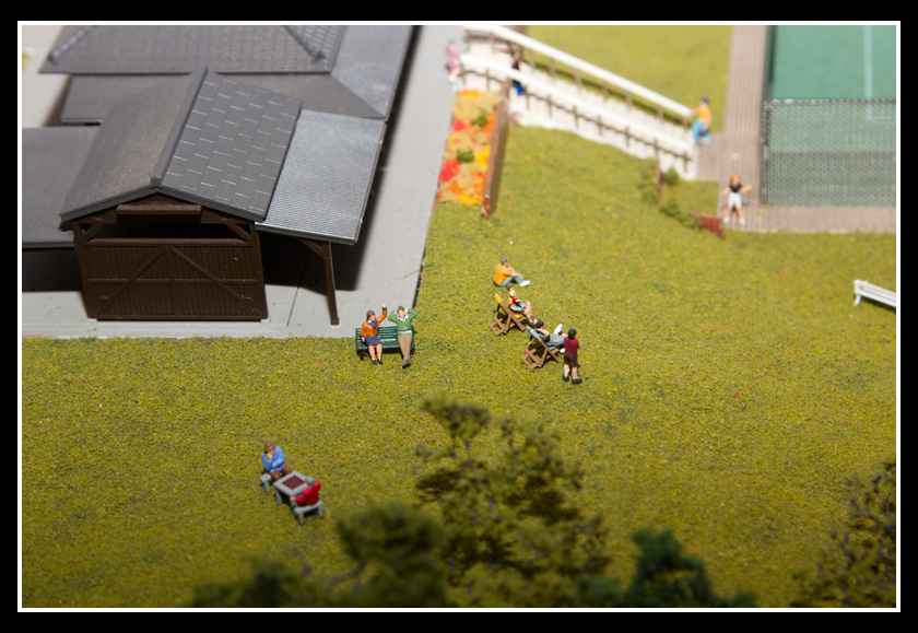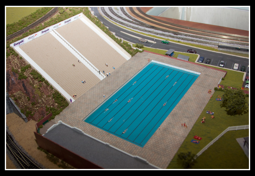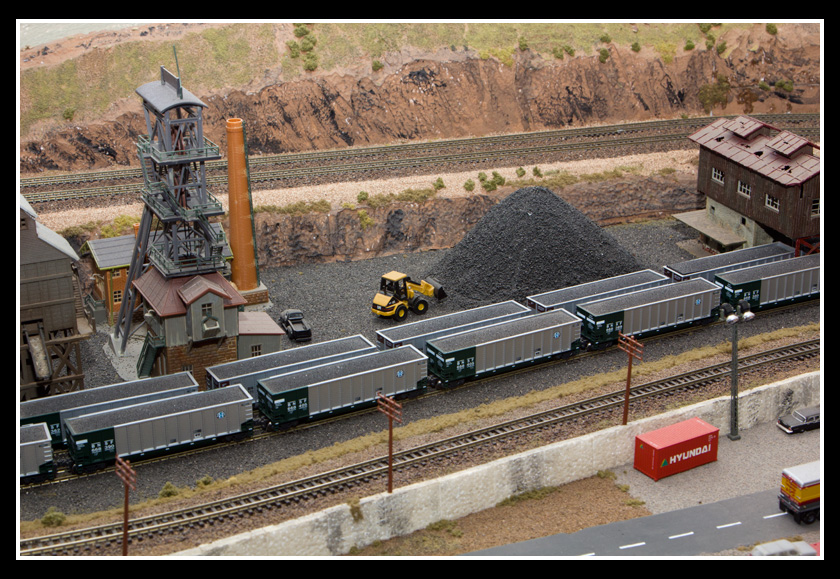 There are 2 towns and at the one return loop, a very large container facility, coal mine, locomotive work shop and more. Everywhere one looks, there are people. There are multitudes of little scenes everywhere. Folk sitting around a table near a steam train, hikers on a mountain ledge, horse rides herding cattle, people around town and a church. The list just goes on and on. Ron challenged everyone to find the person with the “plumbers crack”, the “naked sunbathers” and the “kissing couple”. Did the EMRIG members have fun looking for them. I myself only found the kissing couple when reviewing the photos. So check the photos out for that and much much more.