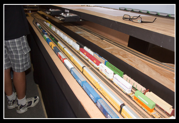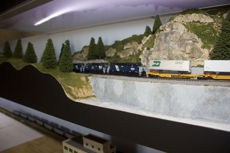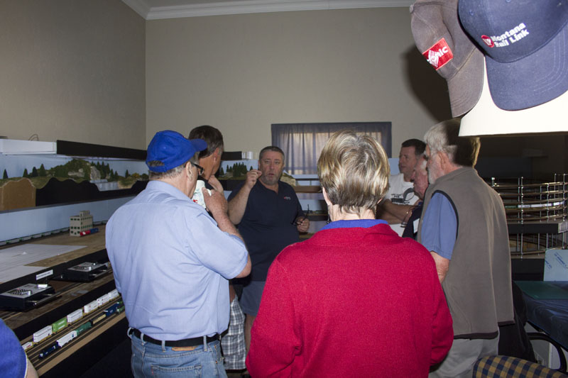 On Sunday 28th August, yes that long ago a bunch of guys from EMRIG, plus a couple of young ladies went to see the progress on this Burlington Northern layout. Since our last visit in June 2014 Kevin has made some changes to the track plan which now includes more passing loops on the third level. The scenery is also coming on (it takes some time for trees and bushes to grow, especially in N gauge) but it is making progress.